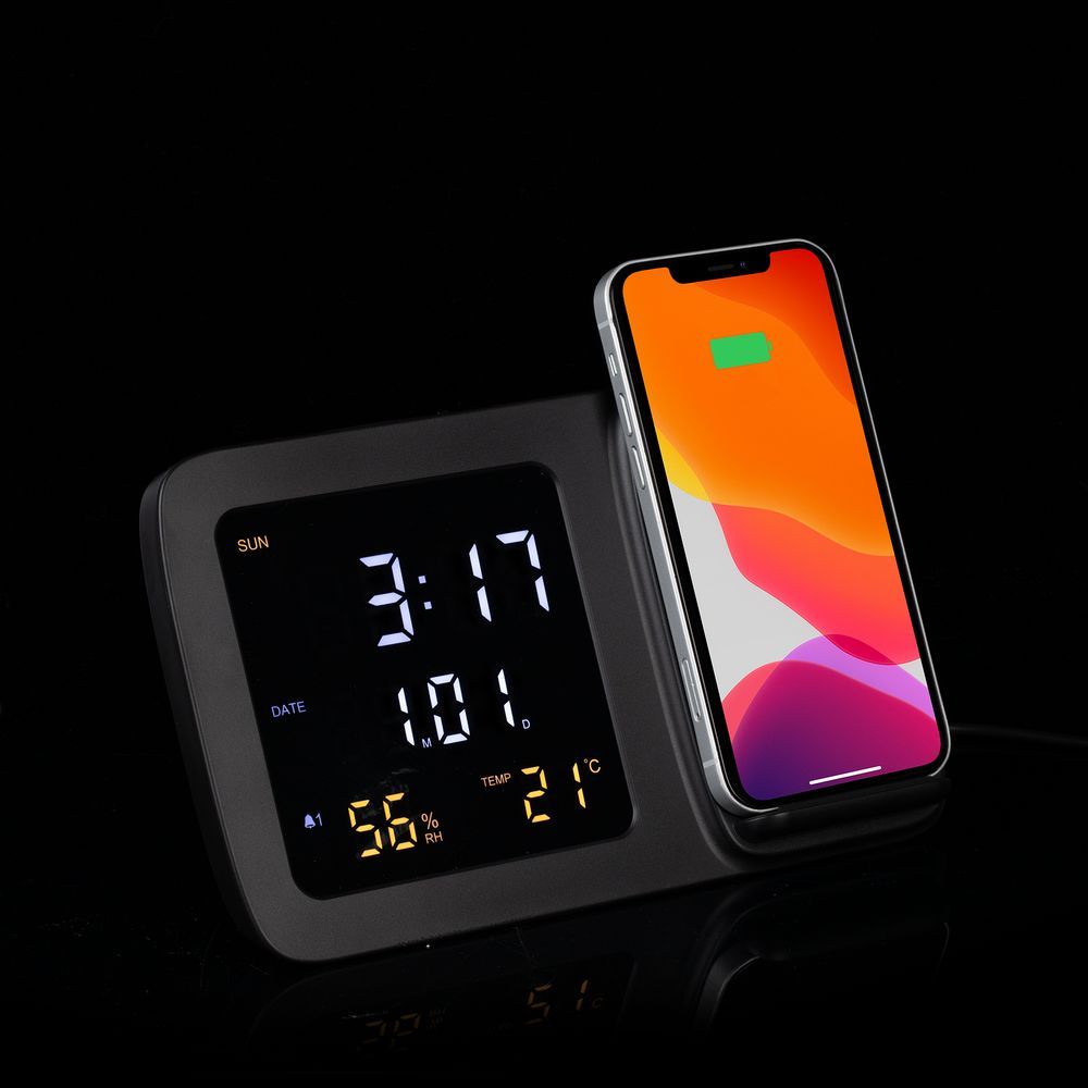 Novem — многофункциональное устройство, которое сочетает в себе функции беспроводной зарядки, настольных часов с будильником, электронного календаря и метеостанции, которая показывает значения температуры и влажности.