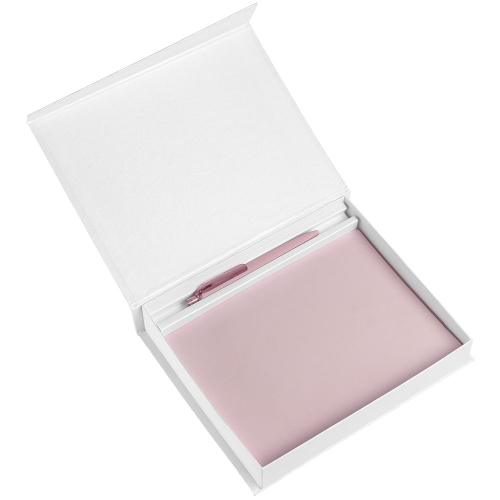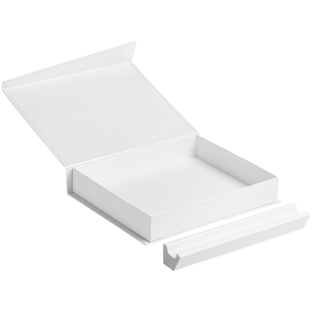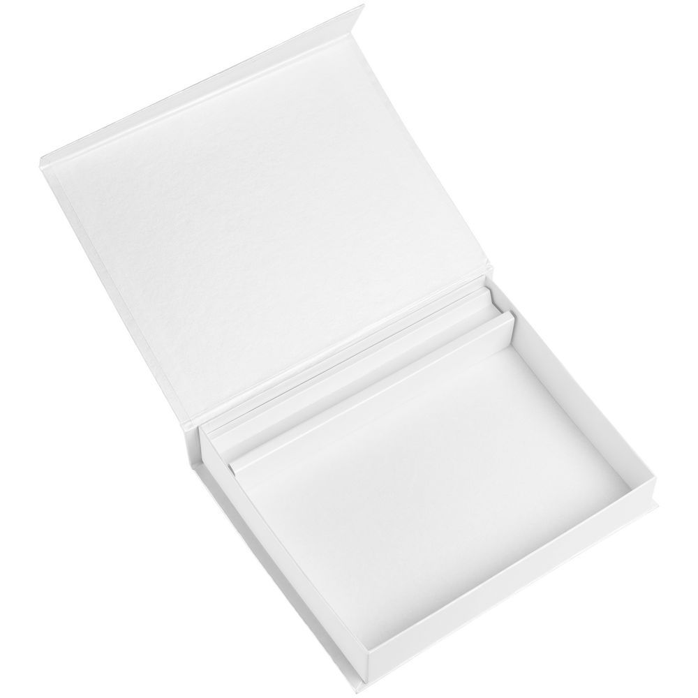 Коробка с клапаном на магните, выполнена из переплетного картона, кашированного белой дизайнерской бумагой Magic.