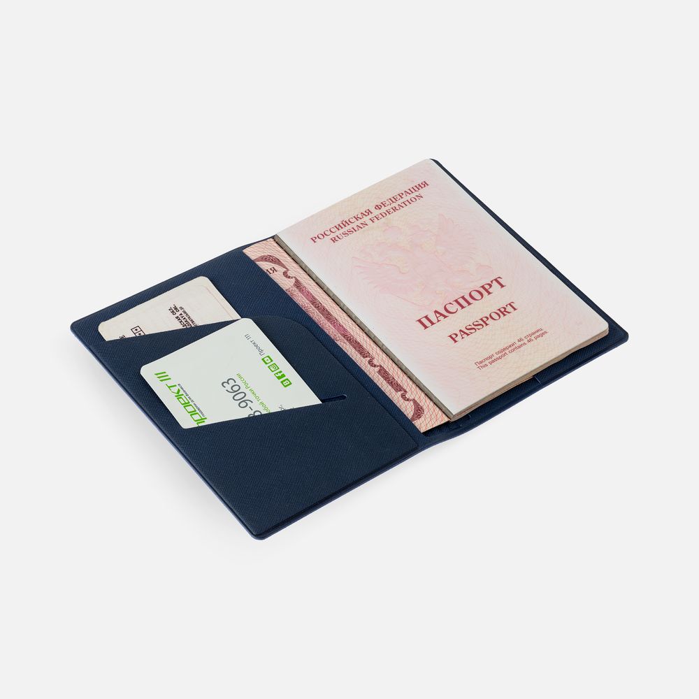 Обложка из искусственного материала, имитирующего сафьяновую кожу, с дополнительными карманами для визиток, полиса ОМС или записок.