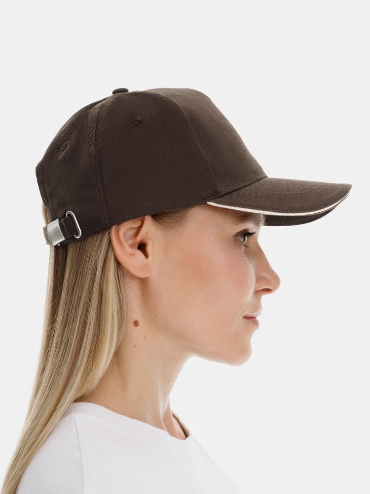 Модель бейсболки с 5-ю клиньями без лобового шва из плотного чесаного хлопка.