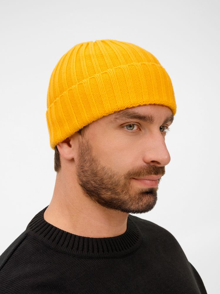Однослойная шапка рельефной вязки с отворотом.