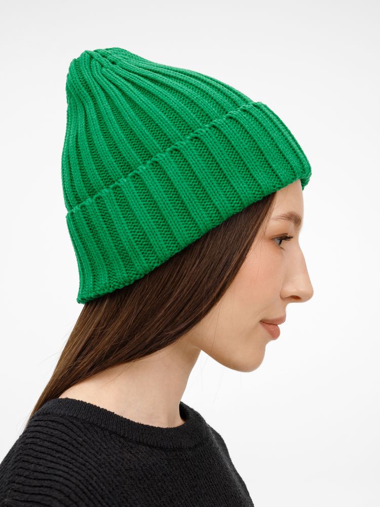 Однослойная шапка рельефной вязки с отворотом.