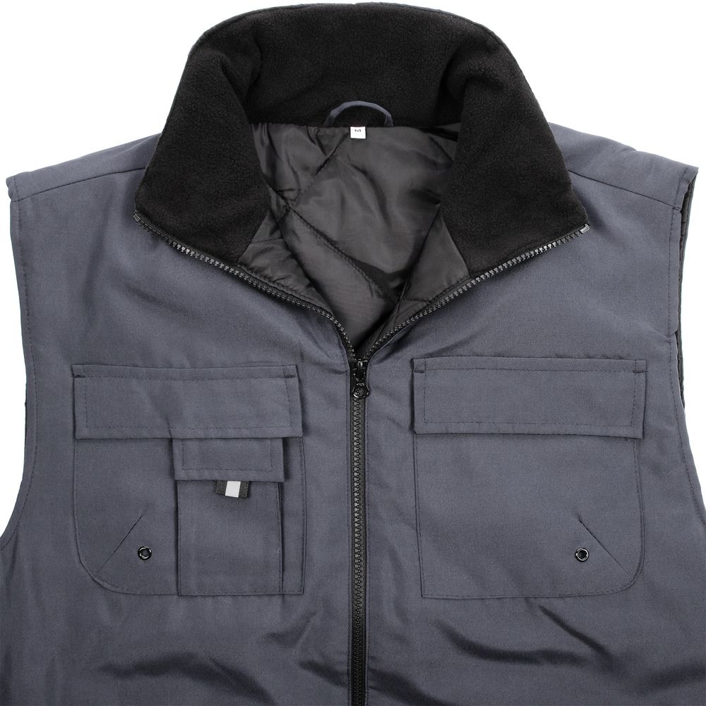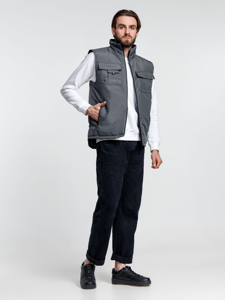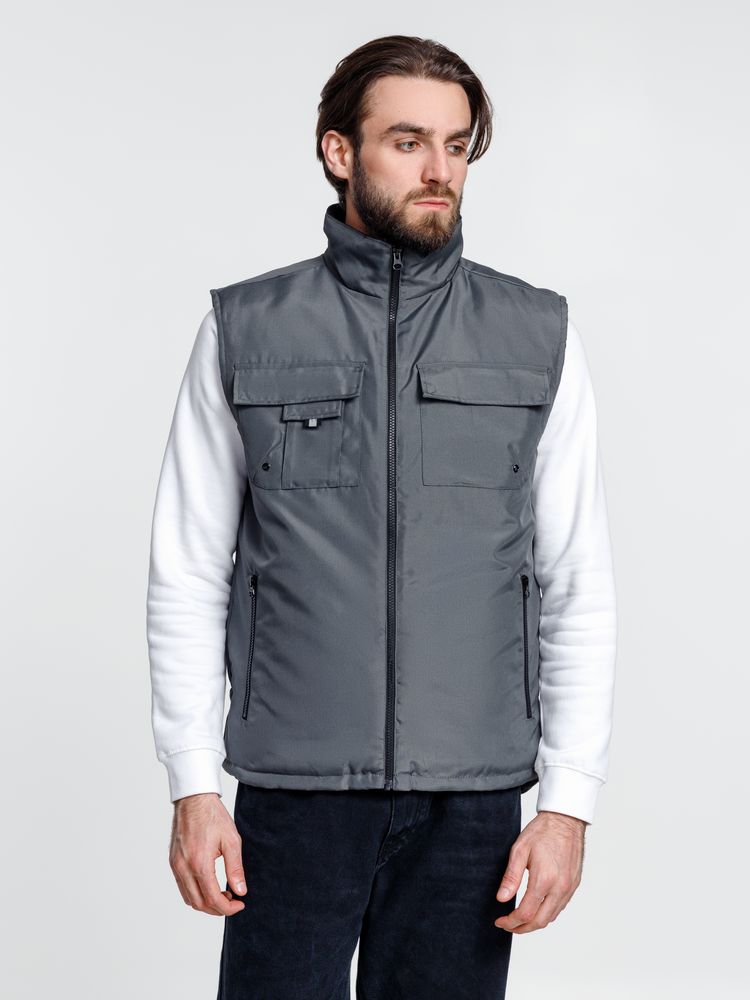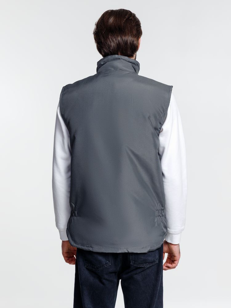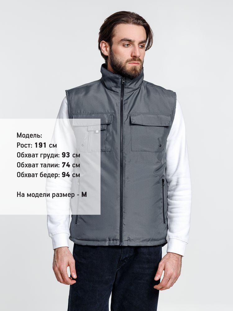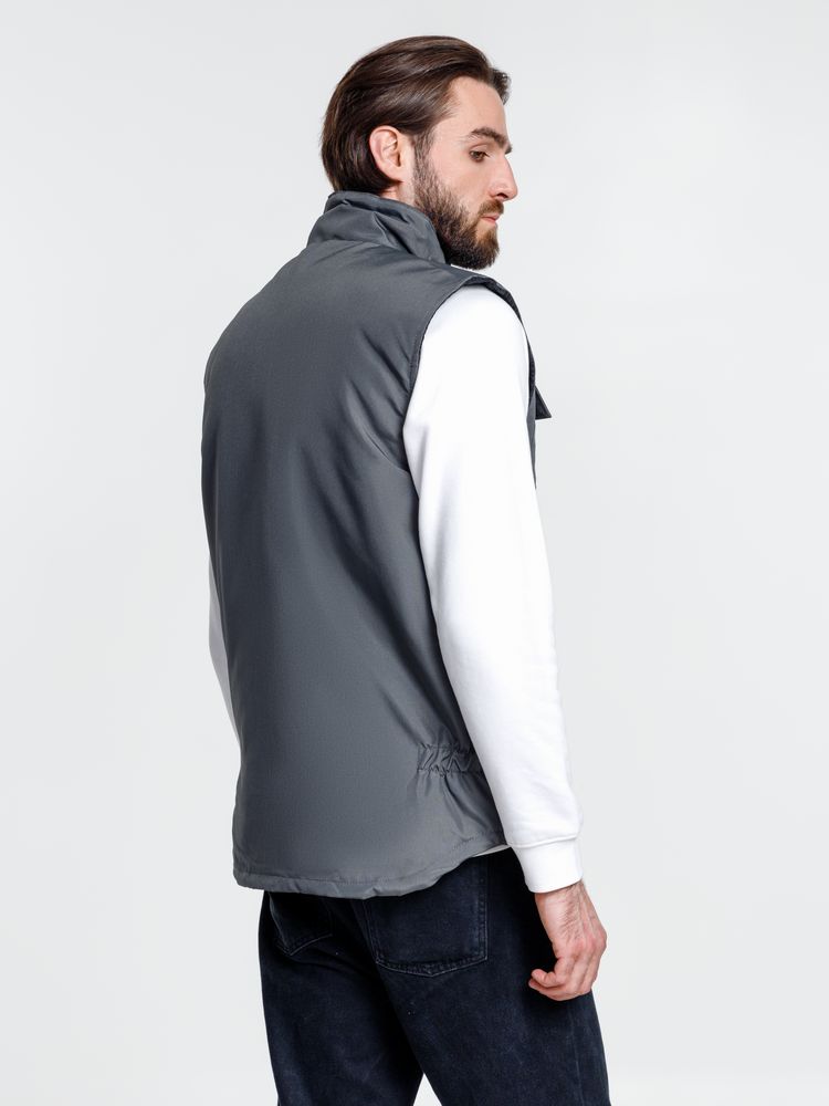 Мужской утепленный жилет с воротником-стойкой и удлиненной спинкой. Выполнен из ткани оксфорд с водоотталкивающим покрытием.