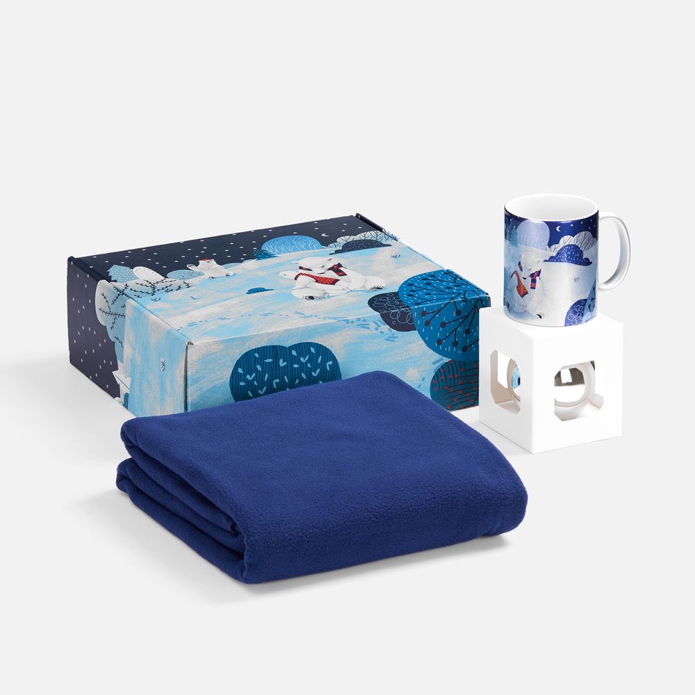 Набор «Праздничный полюс» приглашает окунуться в мир настоящей зимней эстетики и волшебной безмятежности! Это новогодний ансамбль в едином нарядном стиле: мягкий флисовый плед, кружка с тематическим принтом и изящный елочный шарик. Немного сказочные изображения с милыми белыми мишками на подарочной коробке и кружке задают тон всему набору, вызывая радость и улыбку.