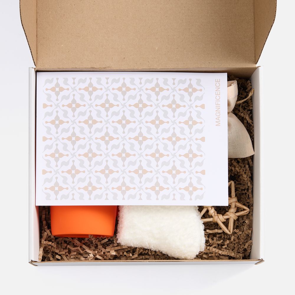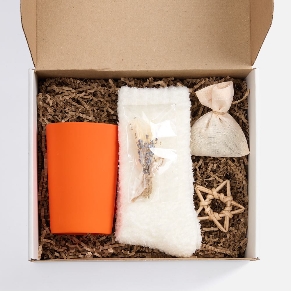 В изящной коробке — лаконичный дуэт, созданный исключительно для комфорта и спокойных мгновений: софт-тач кружка для любимых напитков и мягкие пушистые носки для полного расслабления.