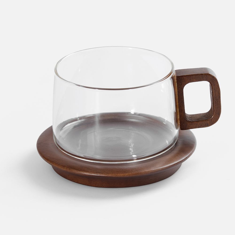 Чайная пара Arbori с чашкой из прочного боросиликатного стекла в сочетании с элементами из ореха станет изюминкой домашней или офисной подачи горячих напитков.