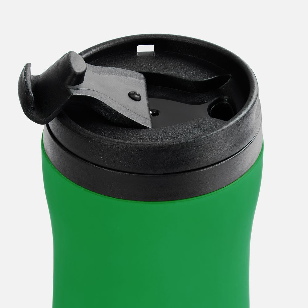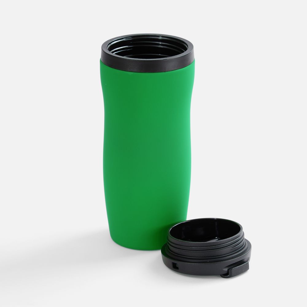 Двухслойная конструкция из нержавеющей стали снаружи и пищевого пластика внутри. Герметичная завинчивающаяся крышка с откидным клапаном для питья. Покрытие софт-тач. В отверстие в крышке можно вставить шнурок для удобного ношения стакана на руке. Шнурок в комплект не входит.