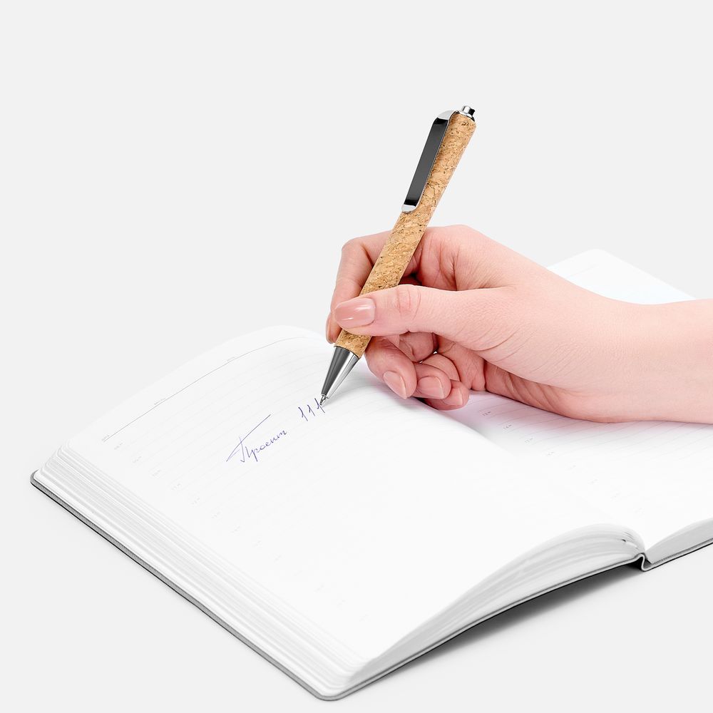 Шариковая ручка с корпусом из пробки крупной текстуры и широким металлическим клипом для нанесения логотипа.