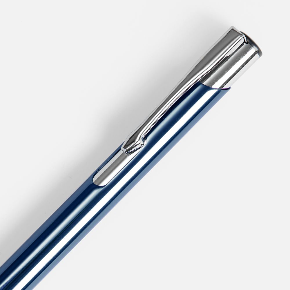 Яркая шариковая ручка с глянцевым цветным корпусом и хромированными деталями.