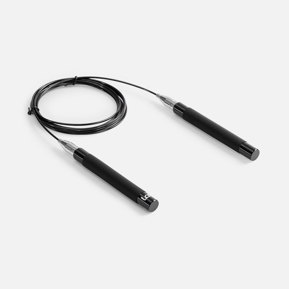 Легкие эргономичные алюминиевые ручки обеспечивают удобный захват, а полиуретановое покрытие предотвращает выскальзывание. Трос с сердцевиной из стального кабеля с гладкой оплеткой из ПВХ не запутывается при скоростном кручении, обеспечивая высокий контроль и управляемость. Система поворотных подшипников, установленная в ручках скакалки, обеспечивает равномерное вращение шнура на 360°.