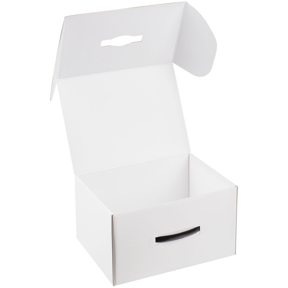 Самосборная коробка-шкатулка со вставной пластиковой ручкой.