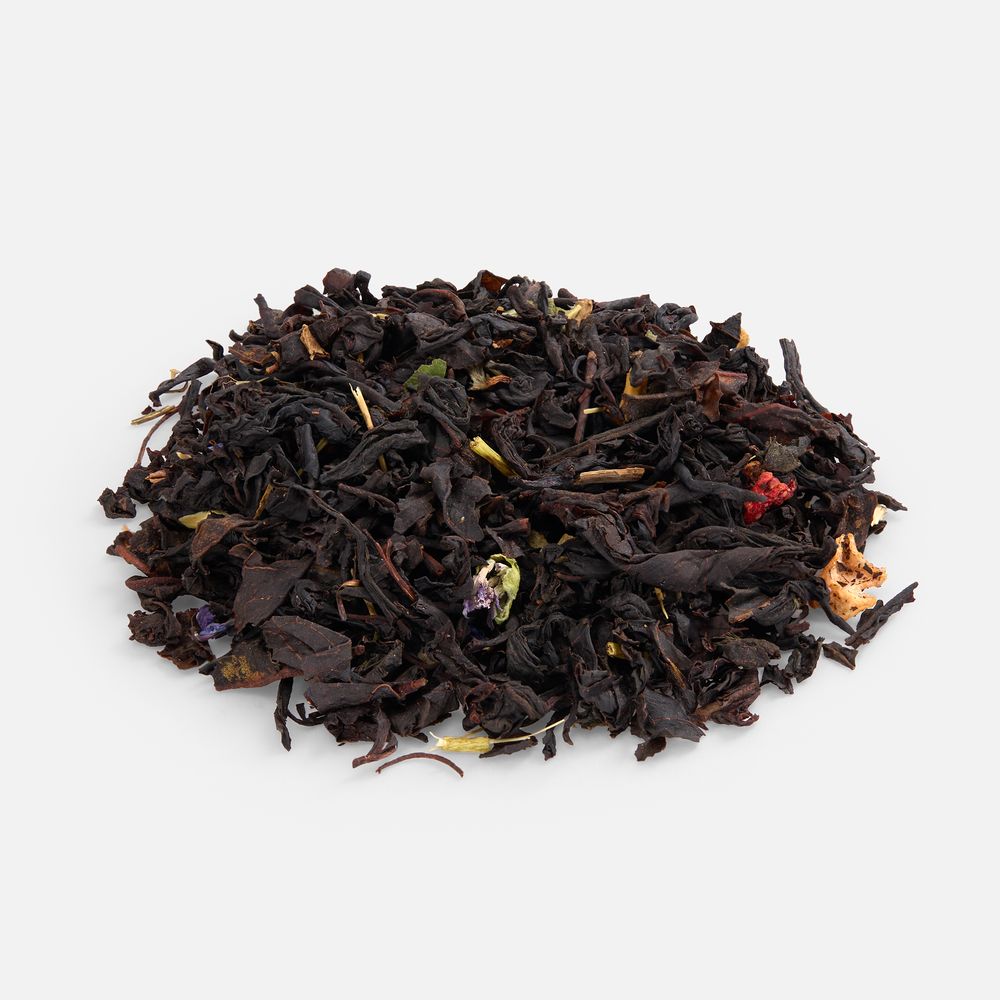 Праздничный купаж на основе черного чая, украшенный цветочными лепестками и кусочками клубники.
