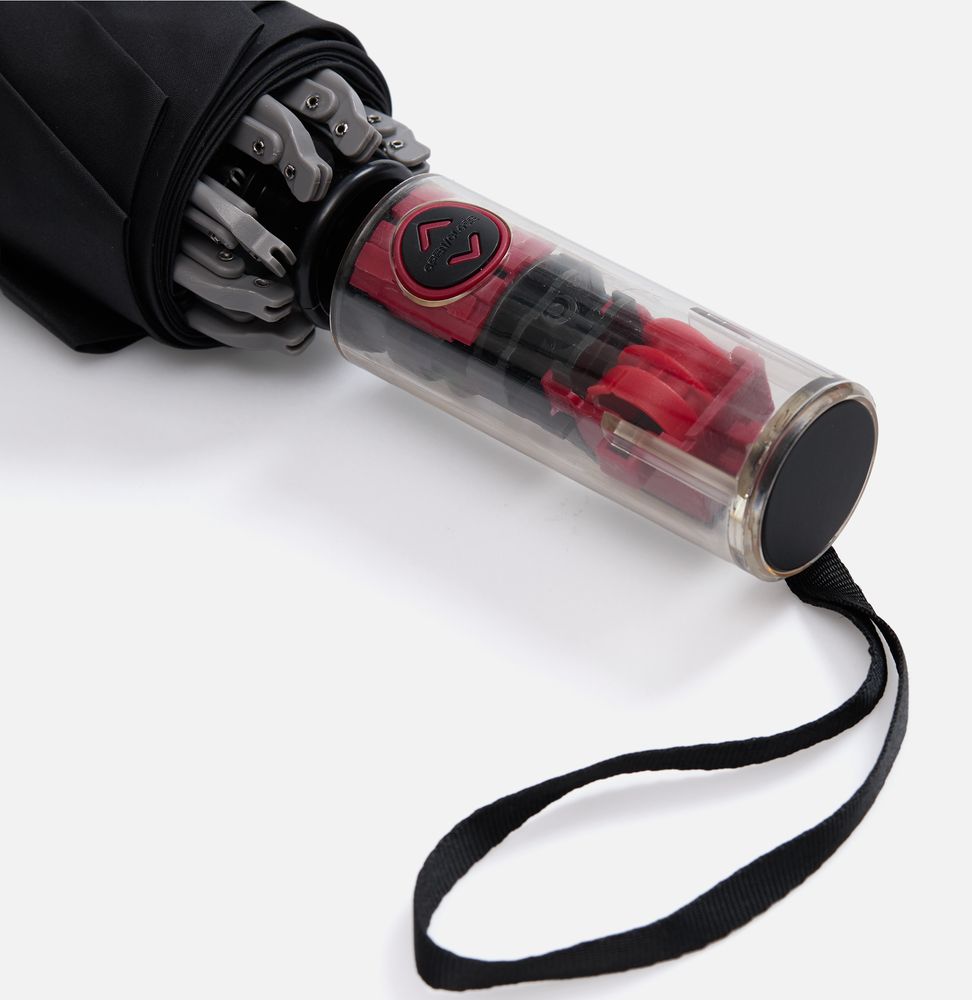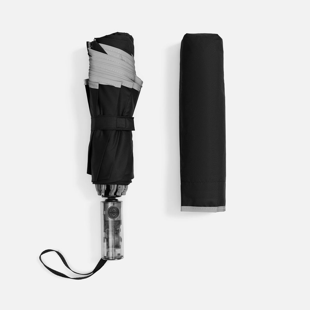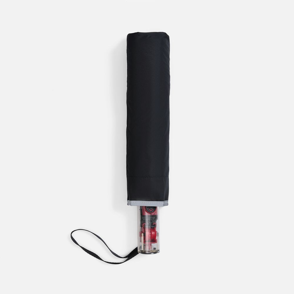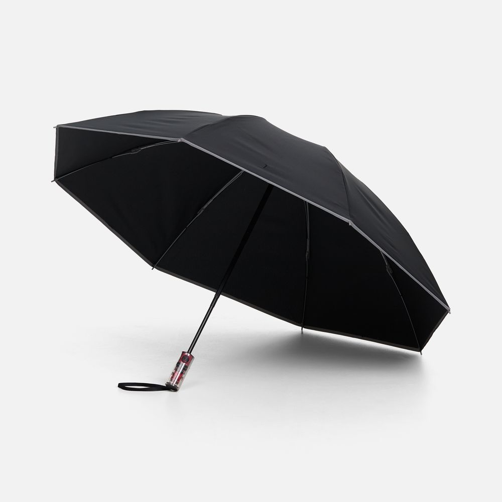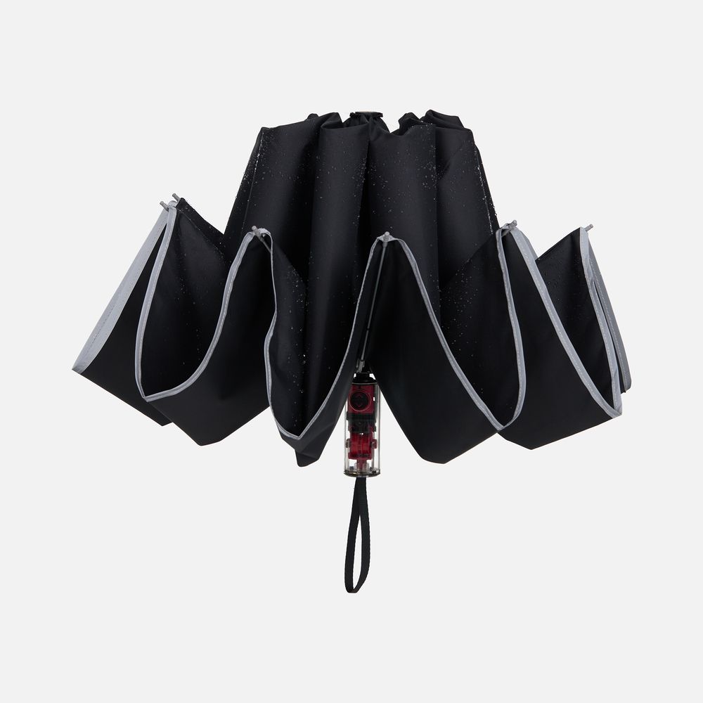 Складной зонт Futurum привлекает внимание оригинальным дизайном. Складываясь после дождя, он прячет мокрую поверхность в себя, а сухая остается снаружи. Светоотражающий кант и ручка из прозрачного пластика, не скрывающая ярких деталей внутри, добавляют внешнему виду зонта футуристичности.