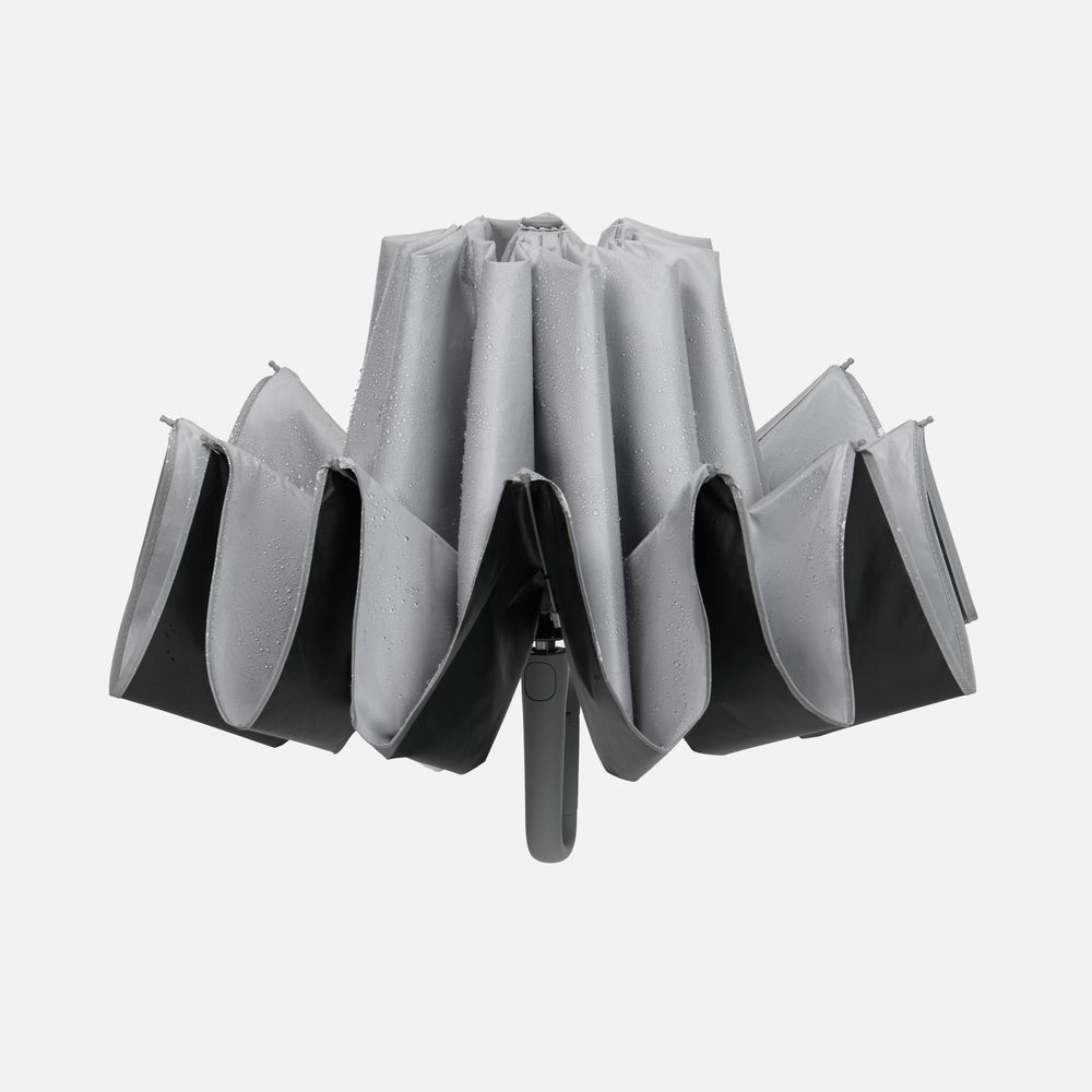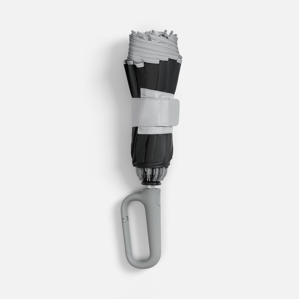 Складываясь после дождя, зонт прячет мокрую поверхность внутри, а сухая остается снаружи: так в закрытом положении он не побеспокоит окружающих и не намочит одежду. За ручку-карабин зонт удобно подвесить, например, на рюкзак.
