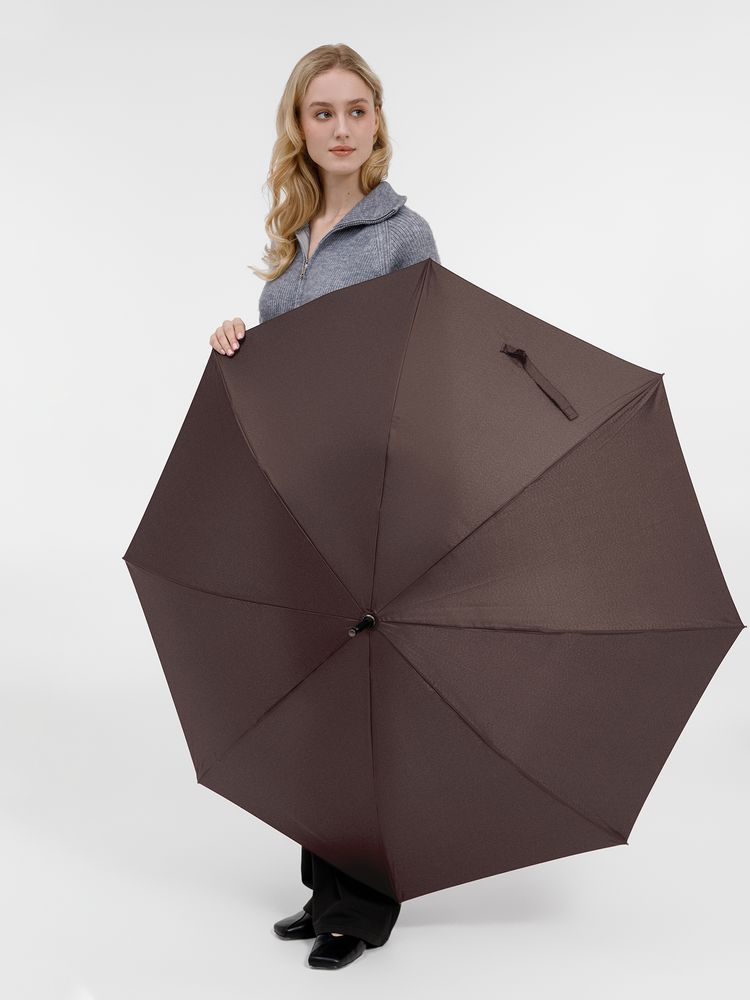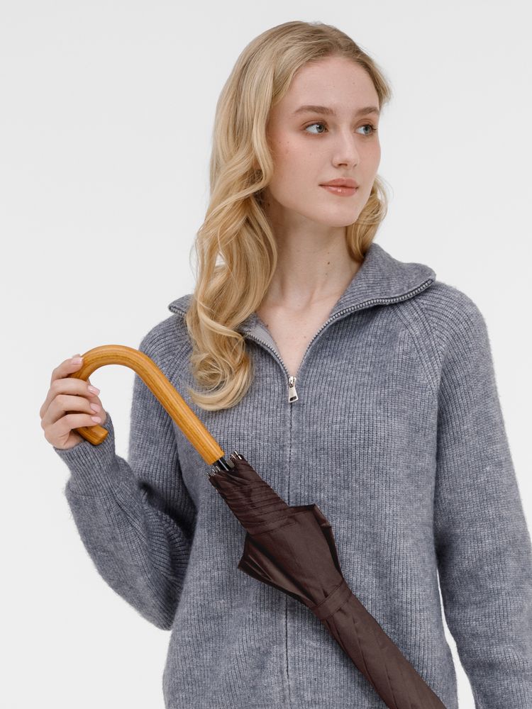Элегантный зонт с большим куполом и деревянной J-образной ручкой.